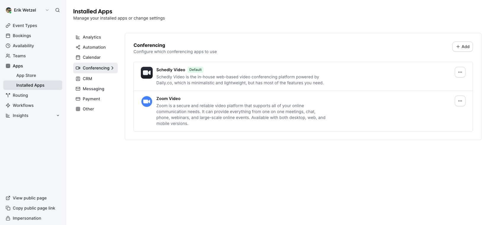 Now, you should be redirected to Schedly's Installed Apps page with the Conferencing Tab selected, and you should see Zoom Video in the list.